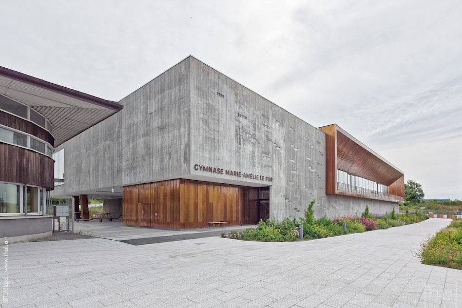 Designed by Bordeaux architects Atelier Ferret Architectures, the Marie-Amélie Le Fur gymnasium blends raw concrete on the façade with a cladding of copper sheeting created by the Balas group.