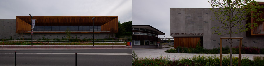 I was passing through Bry-sur-Marne, just a stone’s throw from Paris, when I stumbled across this new gymnasium in gray and copper colors, whose architecture immediately appealed to me.